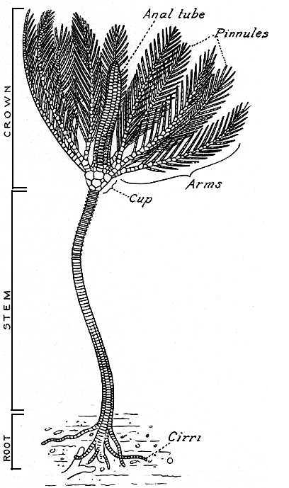 Los crinoideos están formados, en la parte superior por una parte en forma de copa, es el "cáliz", con brazos tentaculares cubiertos de "pínulas", el conjunto que forma el "cáliz" se sustenta sobre un tallo más o menos largo,es el "pedúnculo o columna" que les permite mantenerse fijos, anclados en el fondo, y elevados sobre el sedimento, en el que, generalmente, están enraizados mediante una "base o pie". Algunos géneros presentan el tallo y el pie dotados de unas expansiones tentaculares llamadas "cirros".