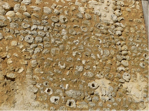 Detalle de otro muro de "piedra seca" en la localidad de Phélipaud, en el que se puede ver que las valvas fósiles de rudistas no están unidas con ninguna clase de mortero aglutinante. Fotografía de Jack ma